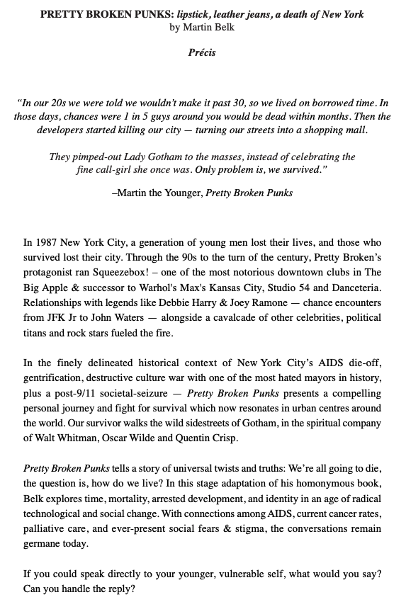Martin Belk writes beautifully and in exquisite detail about a very unique cultural moment in New York. It would be very exciting and potentially even important for audiences to see his writing staged. I wholeheartedly and enthusiastically support the development of this project.