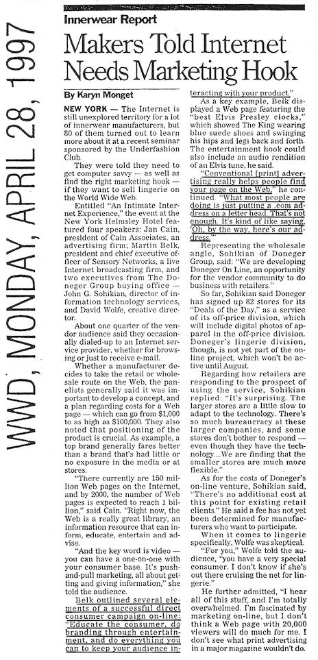 Entitled “An Intimate Internet Experience,” the event at the New York Helmsley Hotel featured four speakers: Jan Cain, president of Cain Associates, an advertising firm; Martin Belk, president and chief executive officer of Sensory Networks, a live Internet broadcasting firm, and two executives from The Doneger Group buying office — John G. Sohikian, director of information technology services, and David Wolfe, creative director.